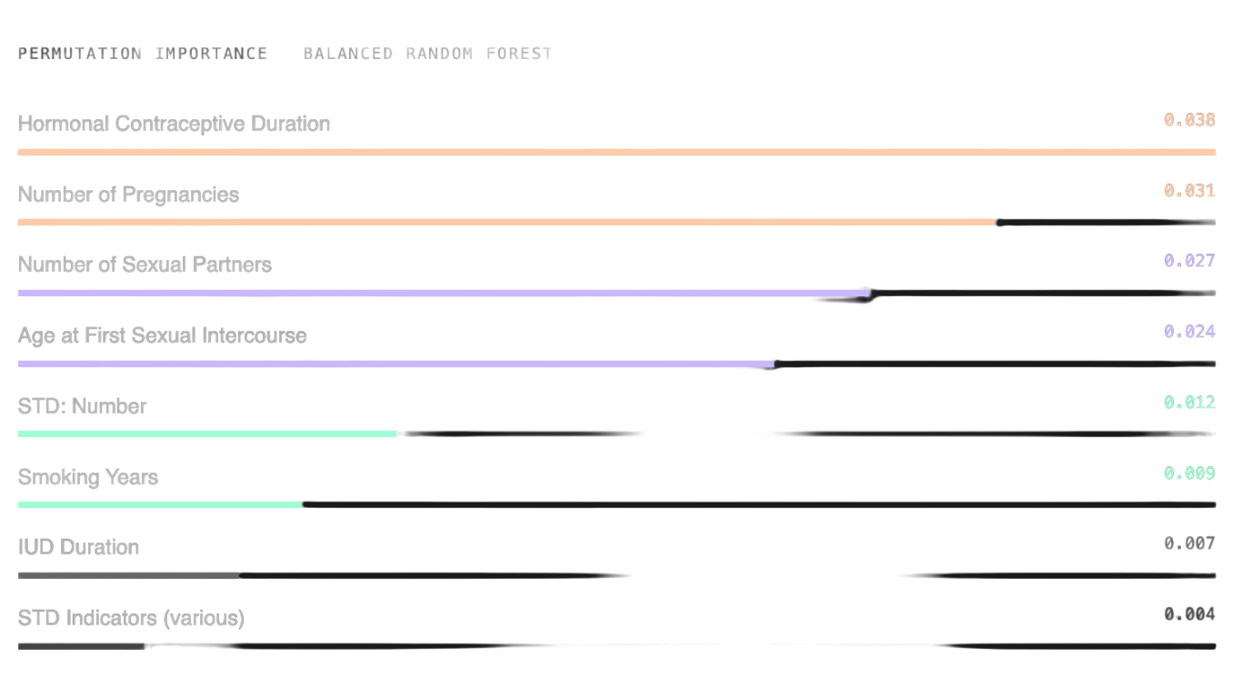 Permutation importance computed on balanced random forest (highest ROC-AUC). Top predictors: hormonal contraceptive duration, number of pregnancies, number of sexual partners, and age at first sexual intercourse.